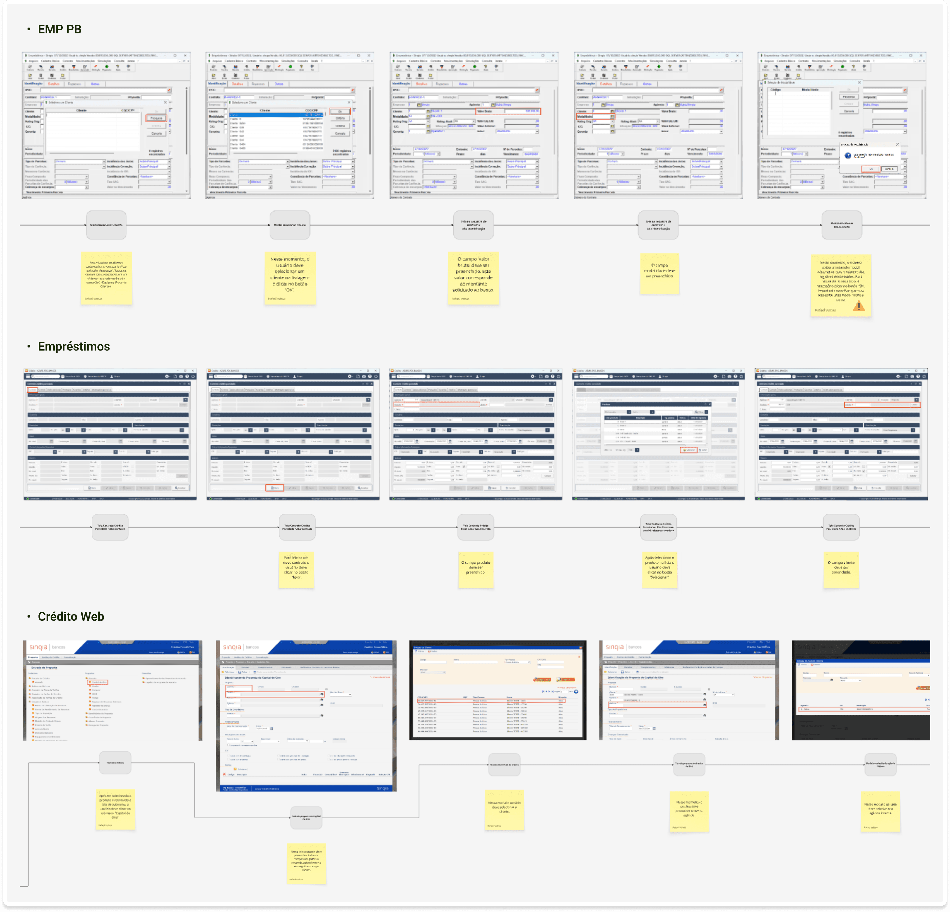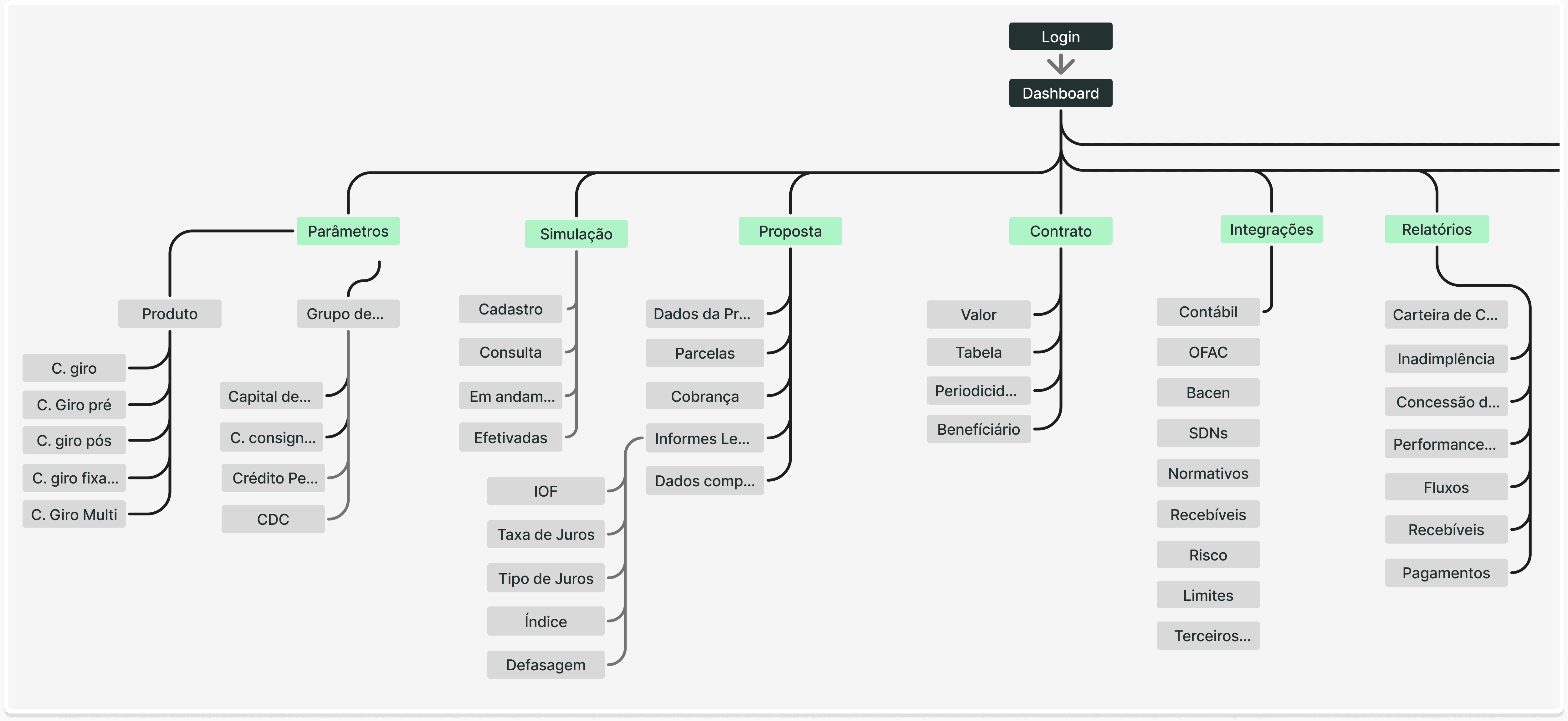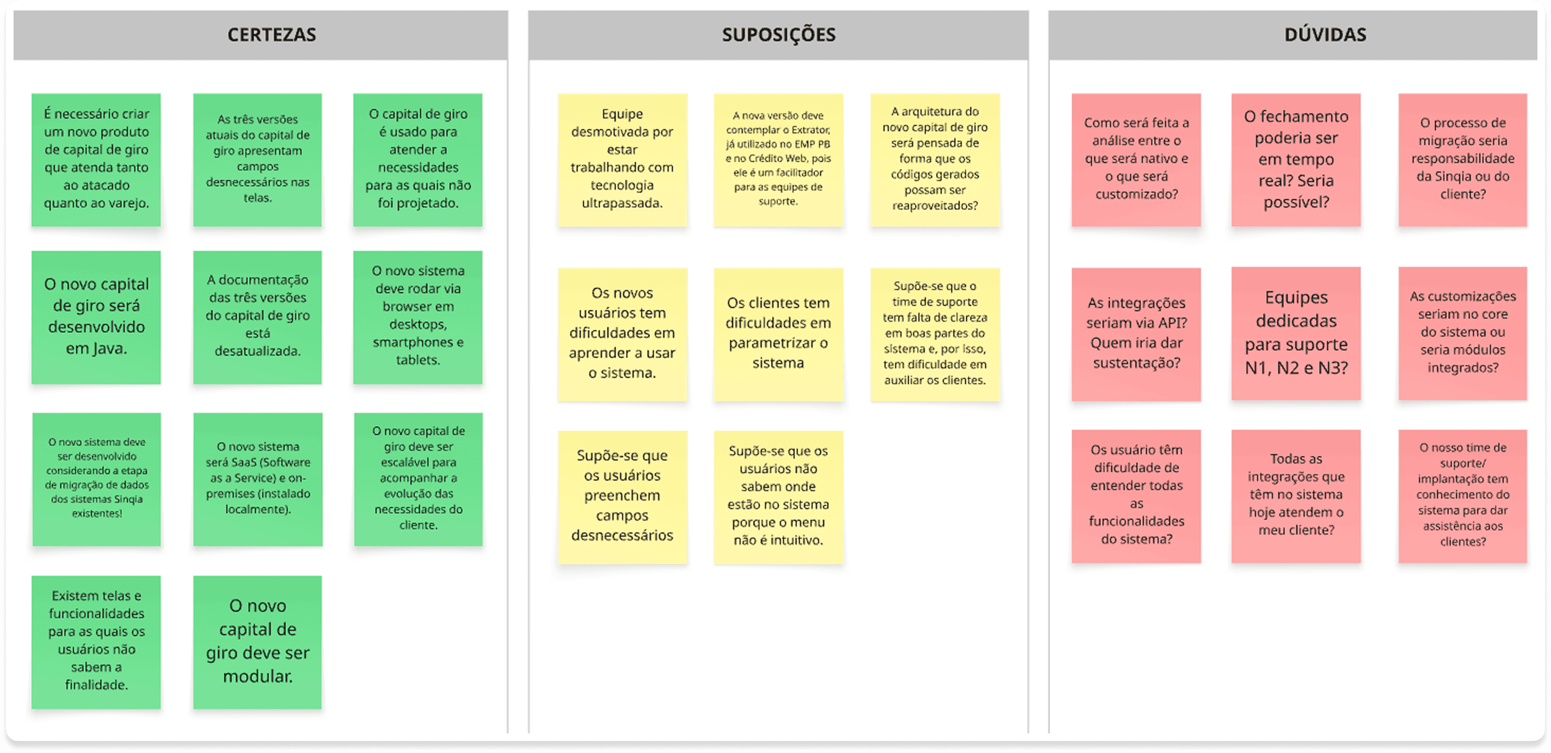 2 - Análise dos sistemas legados: Realizamos um mapeamento funcional de cada uma das três soluções de Capital de Giro existentes, identificando sobreposições, gaps, pontos de fricção e oportunidades de melhoria na experiência dos usuários.
