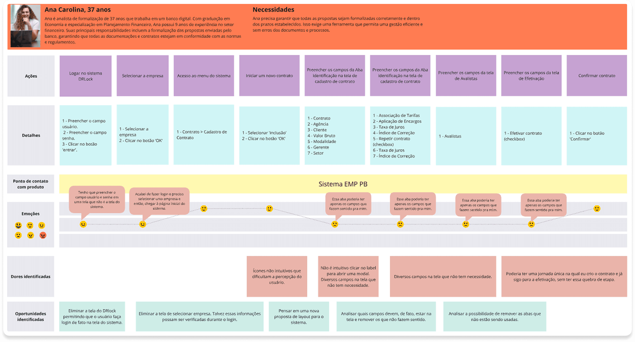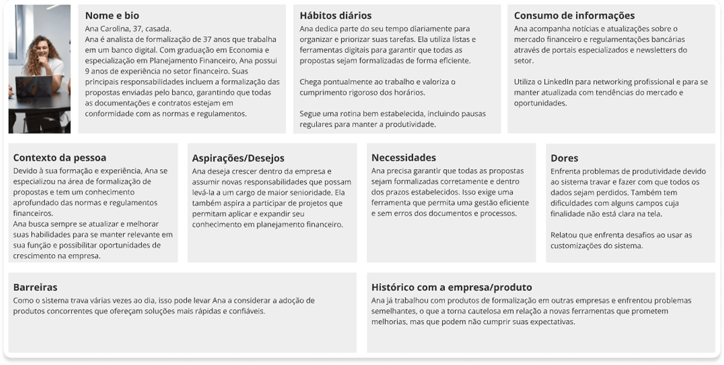 Nossa persona primária é a Ana Carolina, de 37 anos, analista de formalização em um banco digital. Responsável por garantir que propostas e contratos estejam corretos e dentro dos prazos, ela enfrenta dificuldades com um sistema lento, que trava e gera perda de dados, além de telas confusas e customizações complexas. Ana busca uma solução mais ágil e intuitiva, que aumente sua produtividade e a ajude a crescer profissionalmente dentro da empresa.